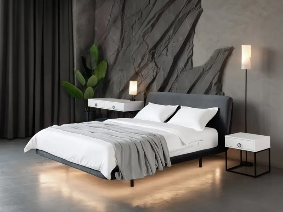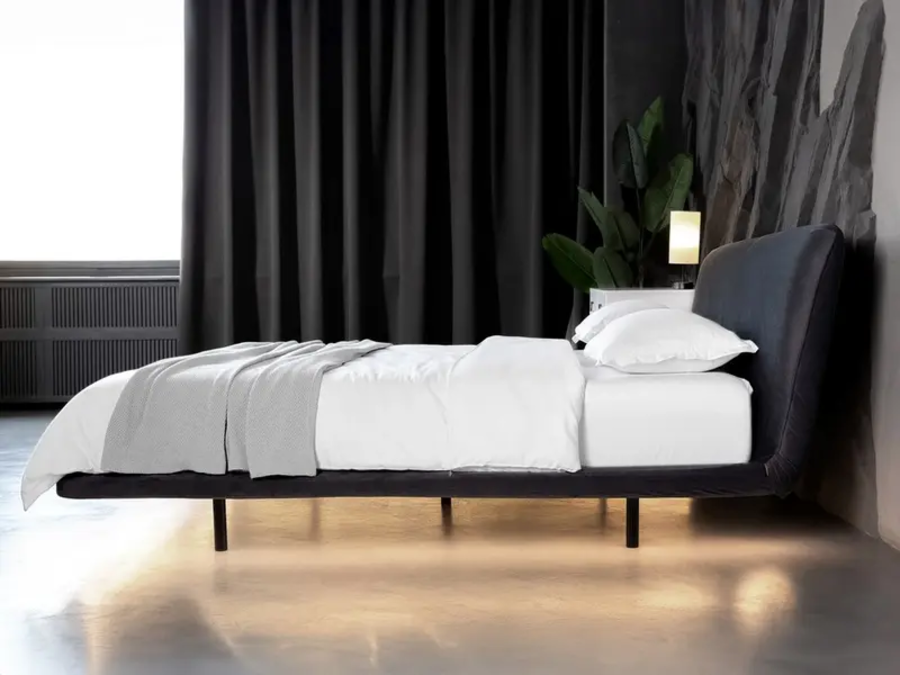 Опорная база кровати смещена к центру, а контур кровати остаётся свободным. Из-за этого создаётся ощущение лёгкости, будто конструкция висит над полом.